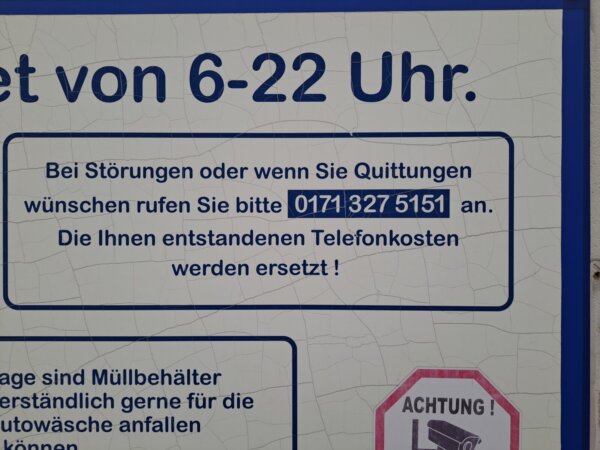 Ich wollte heute: 27.09.2025 der Automat hat einen 5.-€ Schein genommen, aber keine Wertmarken herausgegeben. Betreiber war telefonisch nicht erreichbar. Das ist Unterirdisch....
